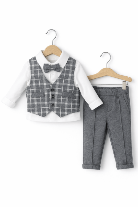 Acest set elegant pentru băieței este alegerea perfectă pentru evenimente speciale sau momente memorabile. Designul clasic cu vestă gri în carouri și papion asortat oferă un look rafinat și modern.