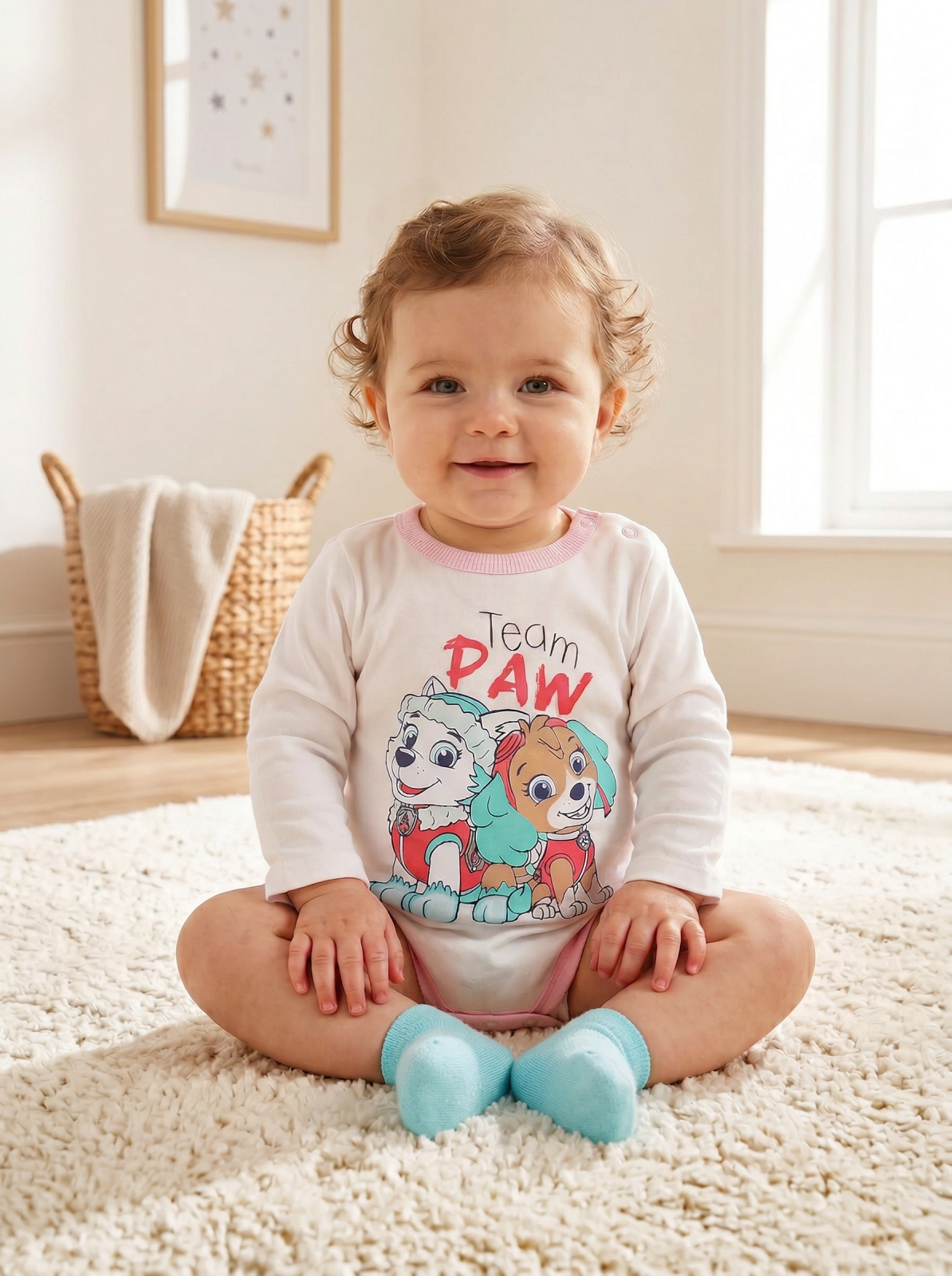 Body din bumbac 100% pentru fetițe 0–18 luni, alb cu roz și imprimeu cățeluși