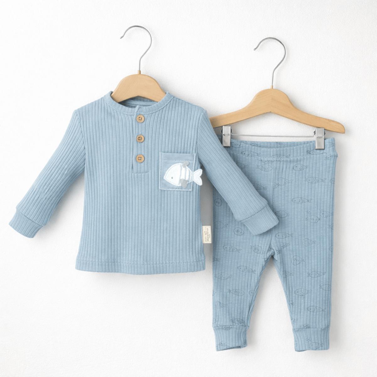 Setul este compus din bluză și pantaloni, având o croială lejeră, care nu limitează mișcarea. Imprimeul vesel cu peștișor și nuanța de albastru conferă un aspect jucăuș și plăcut, potrivit atât pentru purtare zilnică, cât și pentru ieșiri în aer liber.