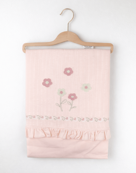 Păturică bebe din bumbac roz cu flori brodate și volănaș