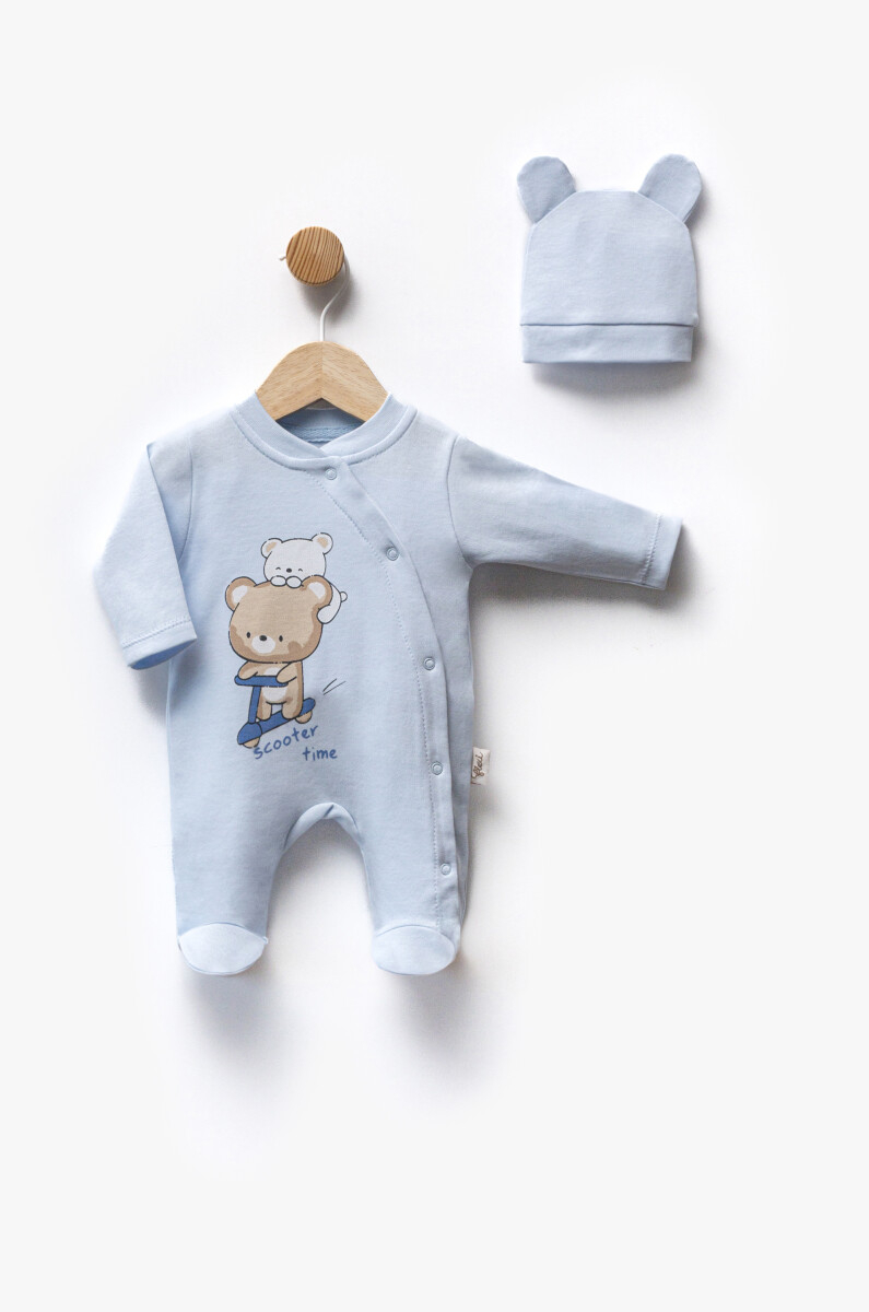Acest set unisex pentru bebeluși (0–6 luni) conține o salopetă și o căciuliță asortată, realizate din bumbac 100% moale și delicat. Materialul este respirabil și blând cu pielea sensibilă, asigurând confort maxim în primele luni de viață.