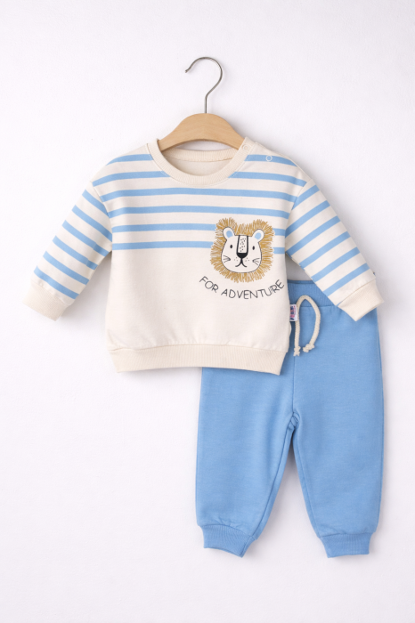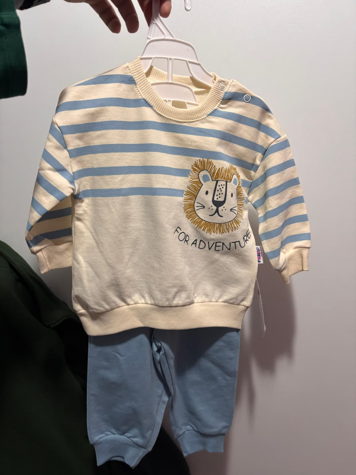 Designul în nuanțe de bej cu dungi albastre deschis este completat de un imprimeu animat cu leu pe bluză, adăugând un aspect jucăuș și plăcut. Setul este potrivit atât pentru purtare zilnică, cât și pentru ocazii casual.
