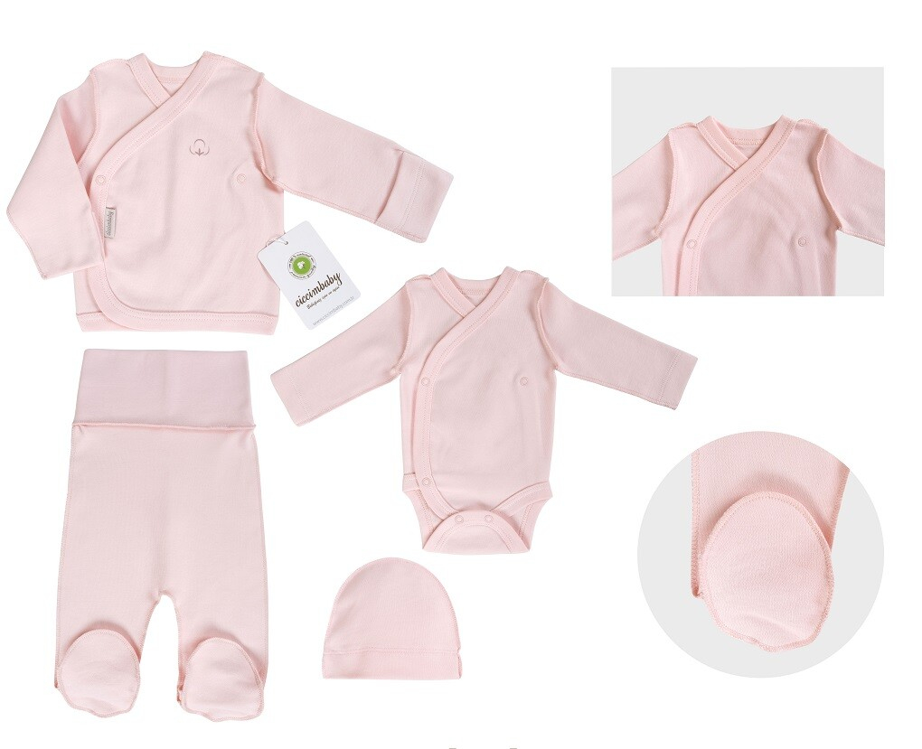 Setul de nou-nascut (0 luni) este compus din 4 piese esentiale si confortabile: bluza inchisa lateral cu capse, body cu maneca lunga, pantaloni cu botosei si caciulita asortata.