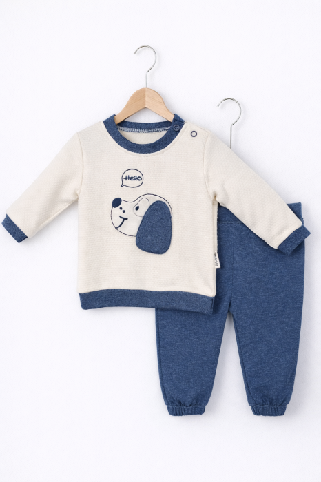 Bluză bej cu imprimeu jucăuș de cățel și pantalonii albaștri creează o ținută plăcută, ușor de purtat și de asortat. Croiala lejeră face ca setul să fie o alegere practică pentru utilizarea zilnică sau pentru a fi oferit cadou.