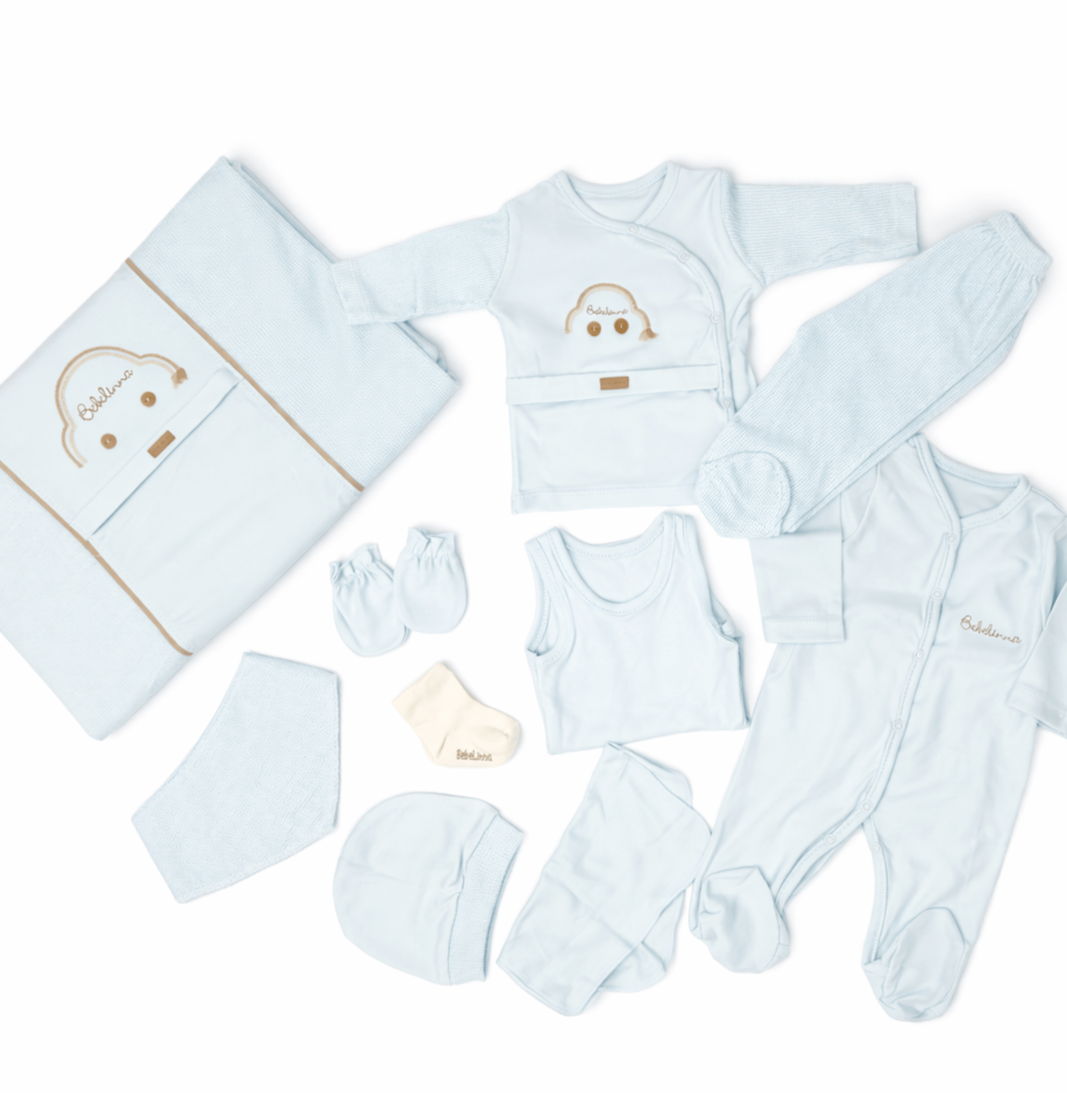 Setul conține toate piesele esențiale pentru maternitate și primele luni acasă, fiind o alegere practică și sigură. Nuanța bleu pastel și designul delicat îl fac ideal pentru băieței și perfect pentru a fi oferit cadou.